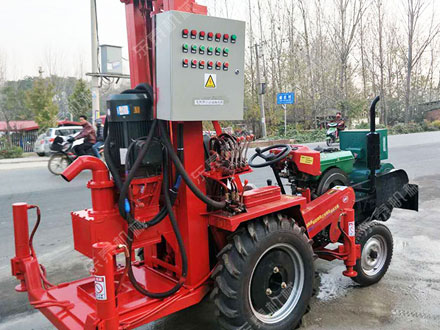 该款液压式打井机,牵引方式运输,采用液压形式,伸缩型架子,缩小产品架子,方便运输,在使用过程中,大大提升了打井的速度,采用7.5KW的电机,可以根据客户的要求定做调速功能。